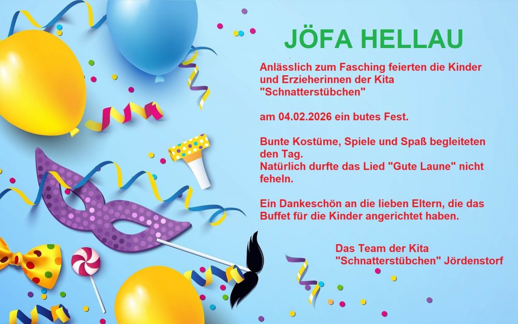 JÖFA HELLAU Beitrag veröffentlicht:6. Februar 2026 Beitrags-Kategorie:Allgemein Lebenshilfe Güstrow e.V. / Kita / Kita "Schnatterstübchen" Das könnte dir auch gefallen Osterfest in der Kita „Schnatterstübchen“ 28. März 2024 Vorlesetag in der Johann-Wolfgang von Thünen-Schule in Jördenstorf 25. November 2025 Tagespflege „Eschenwinkel“ 1. Februar 2023